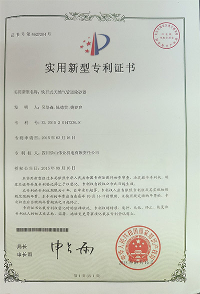 快开式天然气管道除砂器专利证书(专利号:ZL 2015 2 0147236.8)